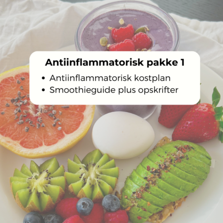 7 dages antiinflammatorisk kostplan med ernæringsinformation samt indkøbsliste. Du får 3 hovedmåltider om dagen, 1 mellemmåltid samt 2 desserter i weekenden på i alt 1400 kalorier/dagligt. Du får minimum 600 gram frugt og grønt om dagen samt den anbefalede mængde kostfiber.